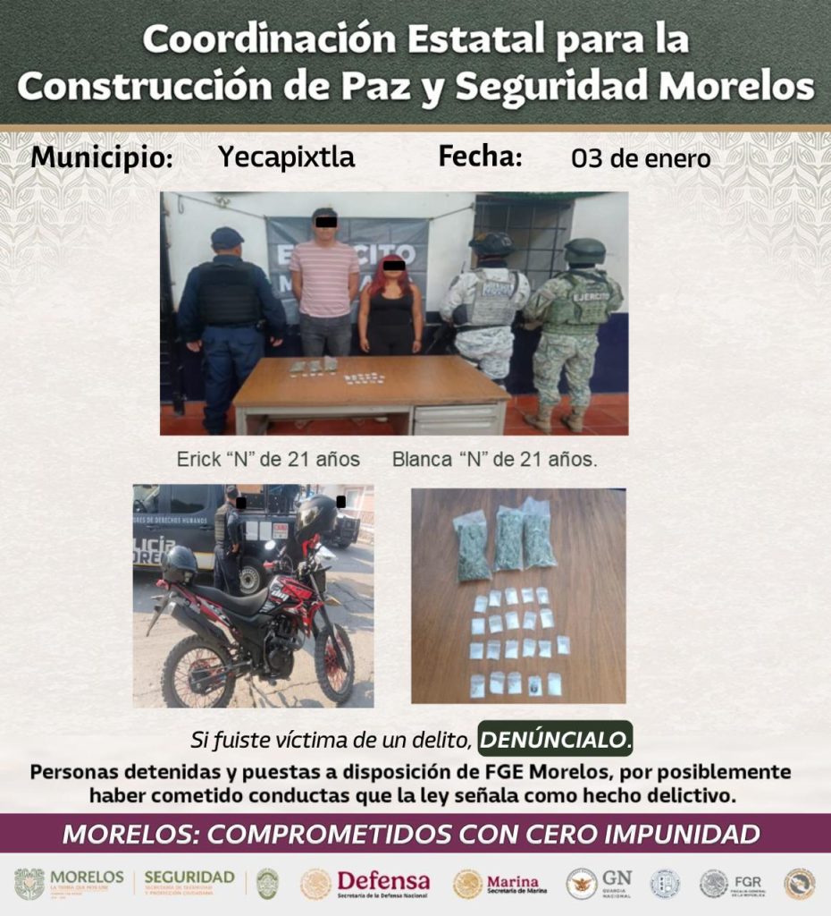 En seguimiento a la Estrategia Nacional Contra la Extorsión, los integrantes de la Mesa Coordinación Estatal para la Construcción de Paz y Seguridad, presentaron detenciones relevantes de diversos generadores de violencia asociados con este delito de alto impacto en los municipios de Cuautla y Yecapixtla.