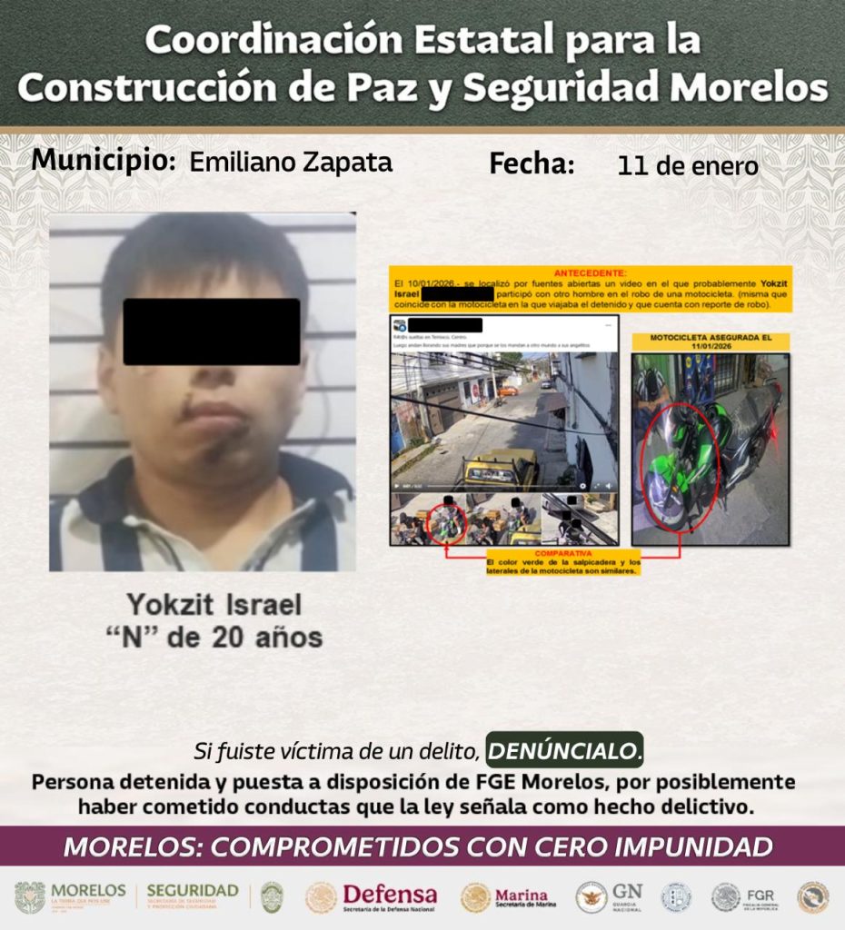 En Yecapixtla, el 12 de enero, fue aprehendido Dagoberto “N” de 23 años, quien conducía a exceso de velocidad una camioneta Suzuki Vitara color gris, sin placas de circulación, en la colonia Centro, la cual contaba con reporte de robo con violencia con fecha 06 de Julio de 2025.